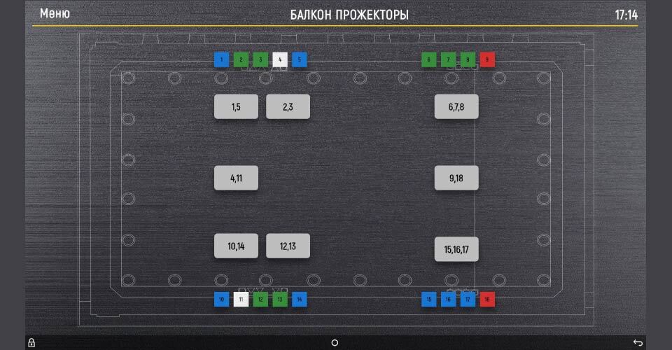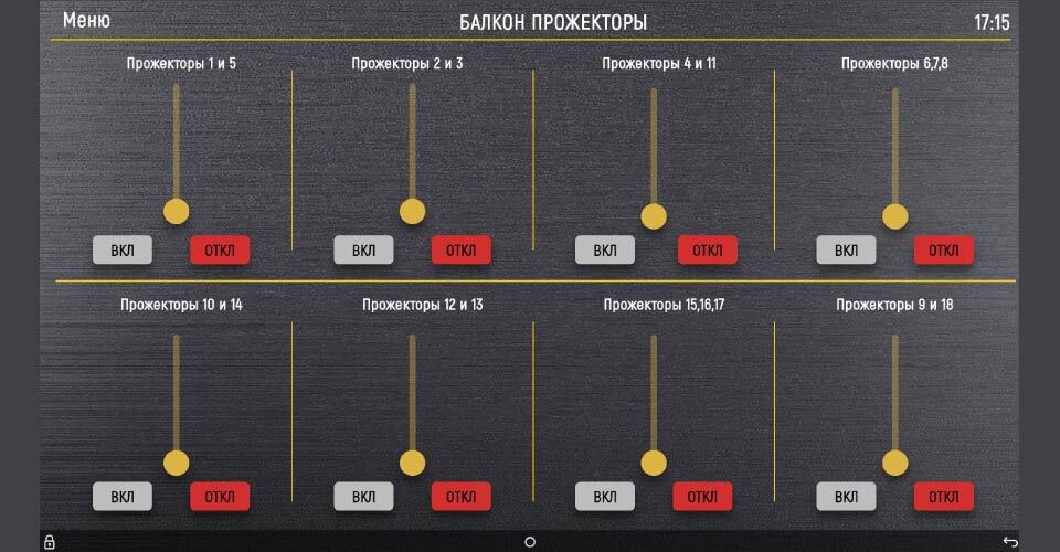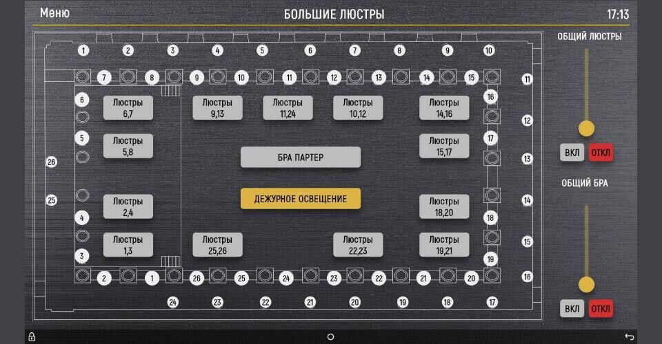 По проектному заданию нужно было организовать удобное и эргономичное управление всем комплексом освещения (люстры, бра, прожекторы) из нескольких точек площадки. Так, старые распределительные шкафы были заменены на шкафы серии DIMRACK с сохранением линий управления «как было», чтобы минимизировать монтажные работы и не повредить исторический паркет помещения. Для управления нагрузкой использованы силовые модули в исполнении: два канала по 5 кВт и четыре канала по 3 кВт.