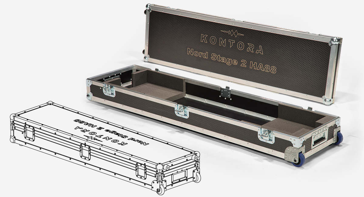 В заказе, помимо рэков, были и другие кейсы. Такие, как транспортировочный кофр для клавиш Nord Stage2 HA88. Особенность кейса - угловые колеса для удобной транспортировки. Кофр имеет гравировку модели оборудования и логотип прокатной компании.