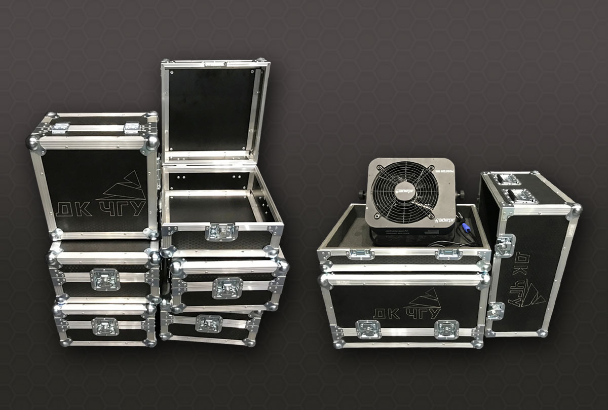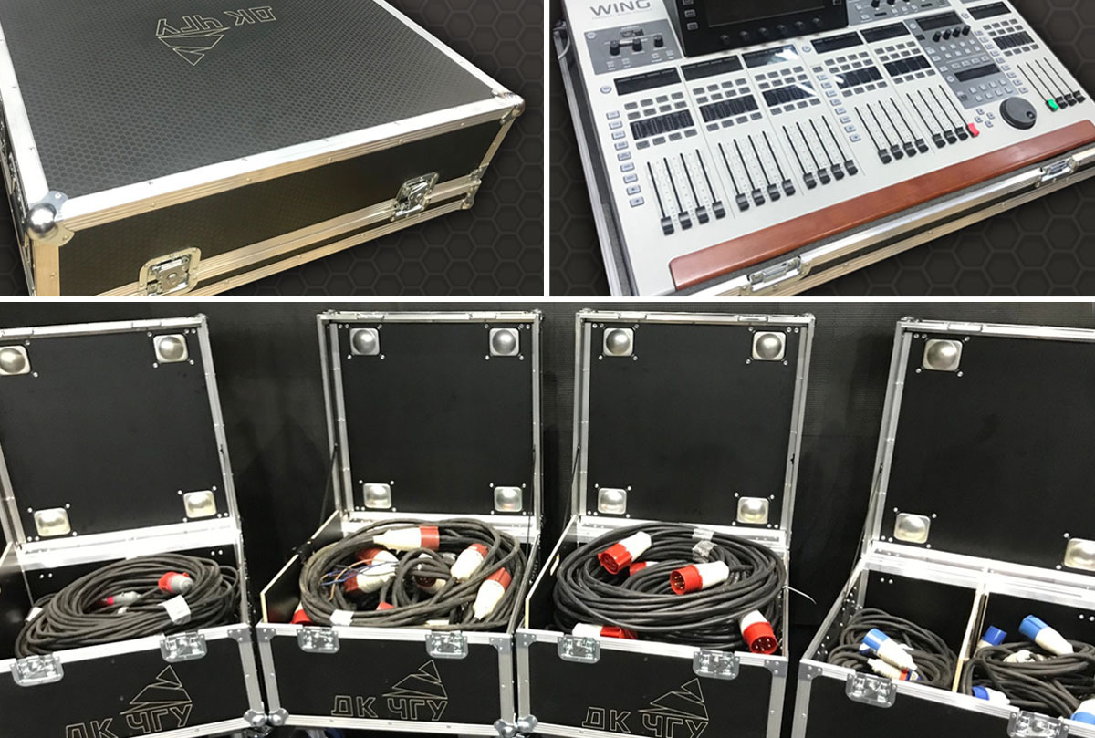 Кейсы для интерактивной панели высокого разрешения 65", телевизоров 43", акустических систем, генераторов спецэффектов, светодиодного экрана, световых приборов, экрана для барабанной установки, телесуфлера, пульта и блоков управления цепными лебедками - всего 59 единиц с гравировкой на основе 14 различных моделей кейсов.