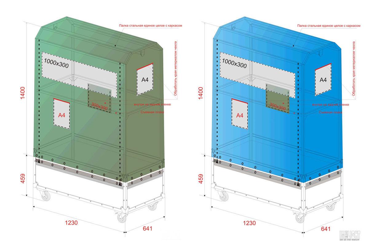 Верхняя часть гардероба представляет собой сварной каркас со съемной перегородкой жесткости. На этот каркас предусмотрен непромокаемый чехол из ткани «Оксфорд-600» с повышенной прочностью и с окном из прозрачной пленки, чтобы не снимая чехол можно было увидеть содержимое гардероба. Чехол имеет карманы для ведомостей и учета костюмов в каждой мобильной конструкции. Снизу чехол фиксируется резиновым шнуром в плетеной оболочке.