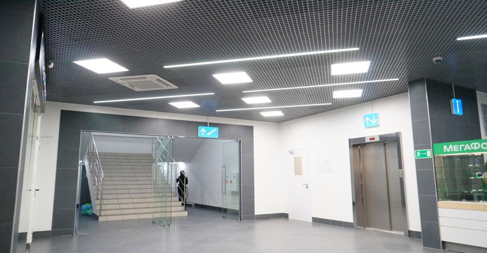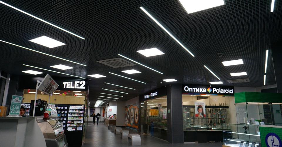 Серия светильников Office-Line отличается высокой цветопередачей (Ra>80), отсутствием мерцания и слепящего эффекта, а также бесшумностью, обеспечивая комфортную работу сотрудникам центра. Офисные светильники имеют цветовую температуру 4000К. Это нейтральный белый цвет, который принято использовать в торговых залах большой площади с самым разнообразным ассортиментом товаров, т.к. он не вызывает искажения цвета продуктов и вещей. Срок службы светодиодов в этих светильниках не менее 70 000 часов, что составляет чуть больше 15 лет работы в режиме 12-часового рабочего дня торгового центра.