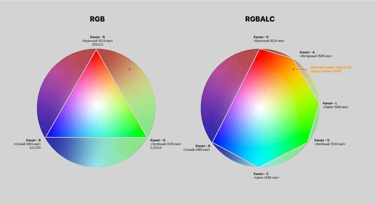 Рис. 2. Сравнение цветового охвата: RGB (треугольник) vs RGBALC (шестиугольник). RGBALC закрывает спектральные пробелы, позволяя точно воспроизводить сложные оттенки (например, 009 Pale Amber Gold (см. Рис 1).