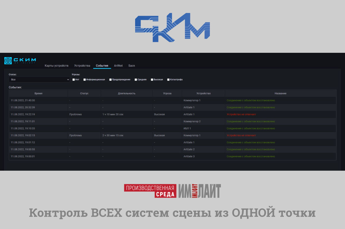 Сентябрь 2022 года. Компания ИМЛАЙТ выводит на рынок уникальный продукт и заявляет о себе как о производителе программного обеспечения. СКиМ, или Система контроля и мониторинга - специализированное системное решение для концертно-театральных площадок, в настоящее время не имеющее аналогов.
