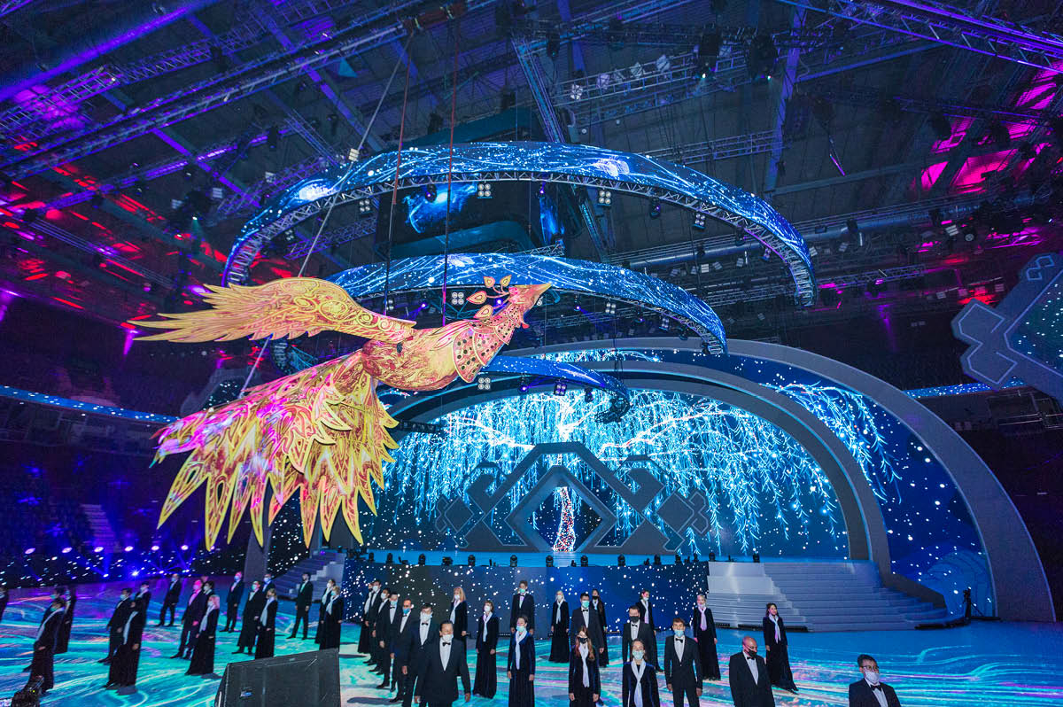 Суммарная длина дороги 120 метров, состоит она из разборных сегментов по 2 метра, что позволяет собрать механическую конструкцию под любые габариты площадки. Так, в «Уфа-Арене» моторизированная дорога, согласно сценографии шоу, была разделена на два пролета – 40 метров и 80 метров, по которым перемещались масштабные декорации с артистами. К слову, в одной из кинематических декораций во время церемонии открытия находился заслуженный артист России и народный артист Башкортостана Аскар Абдразаков. Появление оперного певца на огромной Жар-птице было весьма эффектно, ну а гимн Фольклориады в подобном антураже не исполнялся ни разу за всю историю мероприятия.