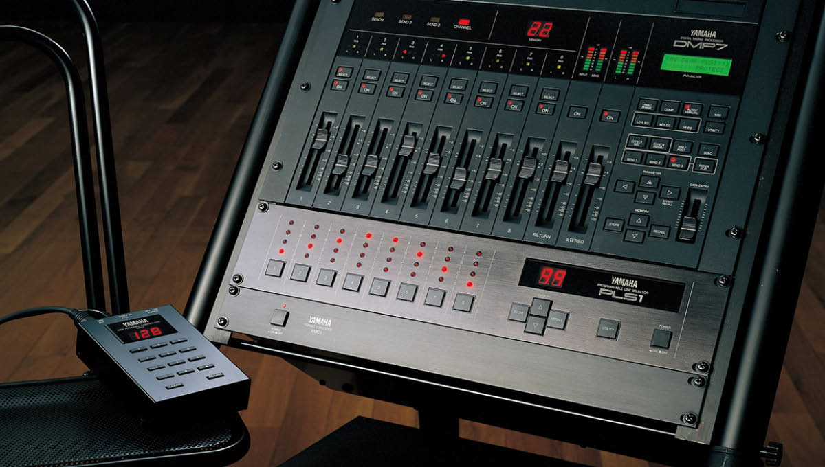 По версии YAMAHA, одним из первых крупносерийных цифровых микшерных пультов был произведён именно компанией YAMAHA. Это была модель DMP7, которая создавалась как микшер сигналов клавишных инструментов (прежде всего DX7) и процессоров эффектов YAMAHA. Несмотря на то, что в конструкции микшера были предусмотрены всего пара микрофонных предусилителей, DPM7 долго оставался востребованным сценическим прибором. Кроме того, этот микшер стал первым профессиональным прибором, который могли позволить себе купить музыканты, а не только крупные студии звукозаписи, как, например, появившийся в то же время цифровой пульт Innovason.