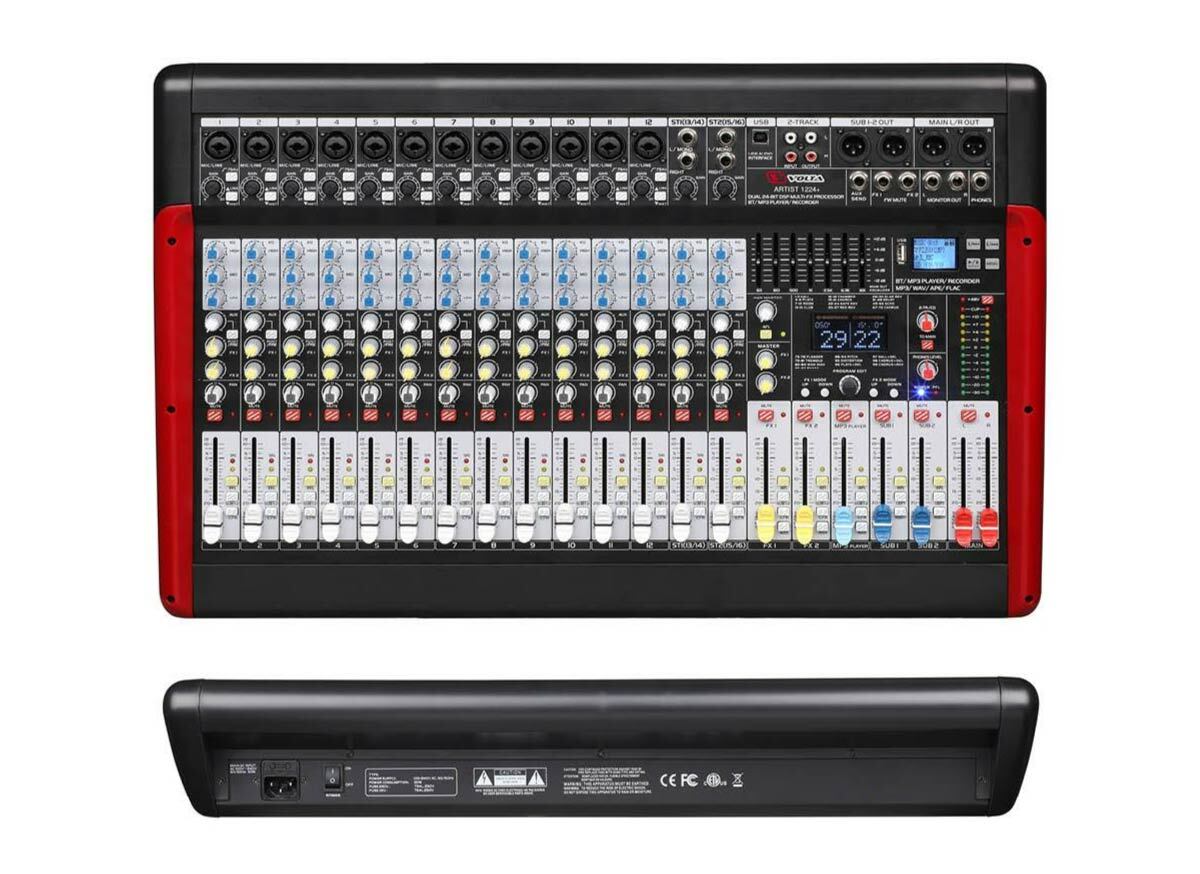 Начнём с микшерного пульта. Прежде всего, микшер должен иметь достаточное количество входных и выходных каналов, в нашем случае это 8-12 микрофонно/линейных входов + 2 стереопары, медиаплеер, читающий USB-накопители и внешние Bluetooth-устройства (поверьте, это важно), процессор эффектов (хотя я являюсь противником использования данного изобретения в ограниченном пространстве репетиционной комнаты или малой сцены) и аудиоинтерфейс. Между цифровым и аналоговым микшером я бы сделал выбор в пользу аналогового в силу простоты работы с ним, стоимости и отсутствия необходимости администратору базы осваивать новую профессию. Думаю, что всеми указанными характеристиками обладает микшер VOLTA ARTIST 1224+. По большому счёту, это не просто микшерный пульт, а аналого-цифровая рабочая станция звукорежиссёра, позволяющая в реальном времени использовать все возможности современного аудио, не прибегая к излишне сложным алгоритмам управления и большим бюджетам.