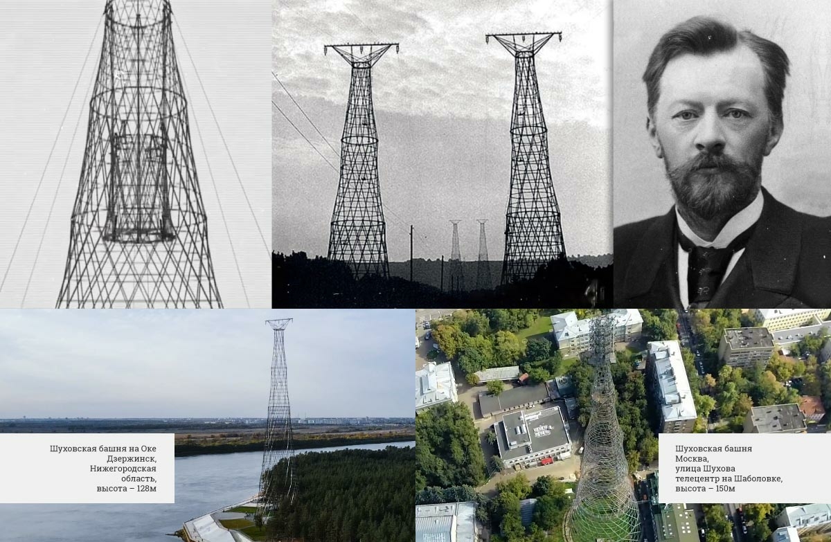 Сегодня Шуховская башня, расположенная в Дзержинске (Нижегородская область) – уникальный памятник русского авангарда, рекомендованный к внесению в список Всемирного наследия ЮНЕСКО. Это единственная в мире гиперболоидная многосекционная опора линии электропередачи, выполненная в виде несущей сетчатой оболочки (первоначально башня входила в комплекс высоковольтного спецперехода через Оку).