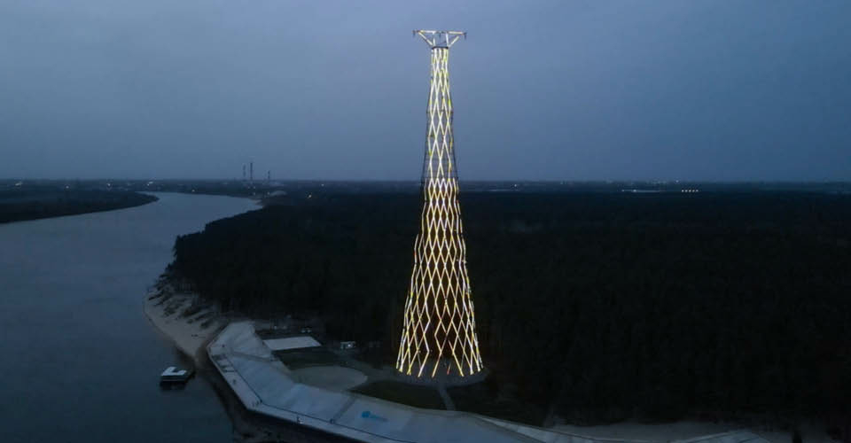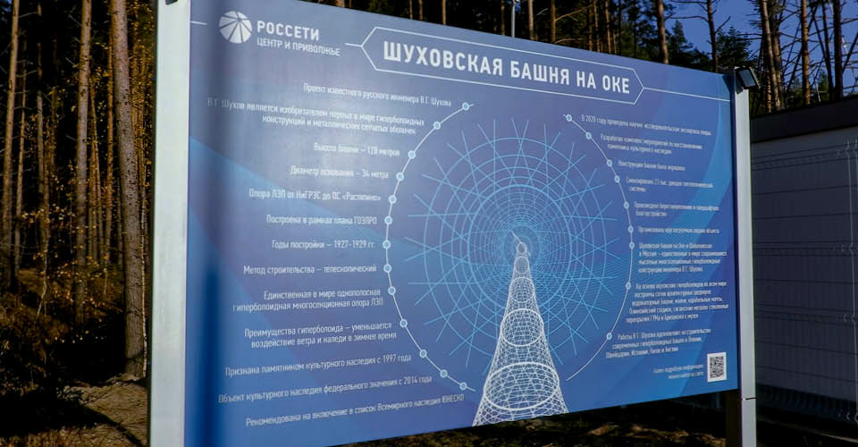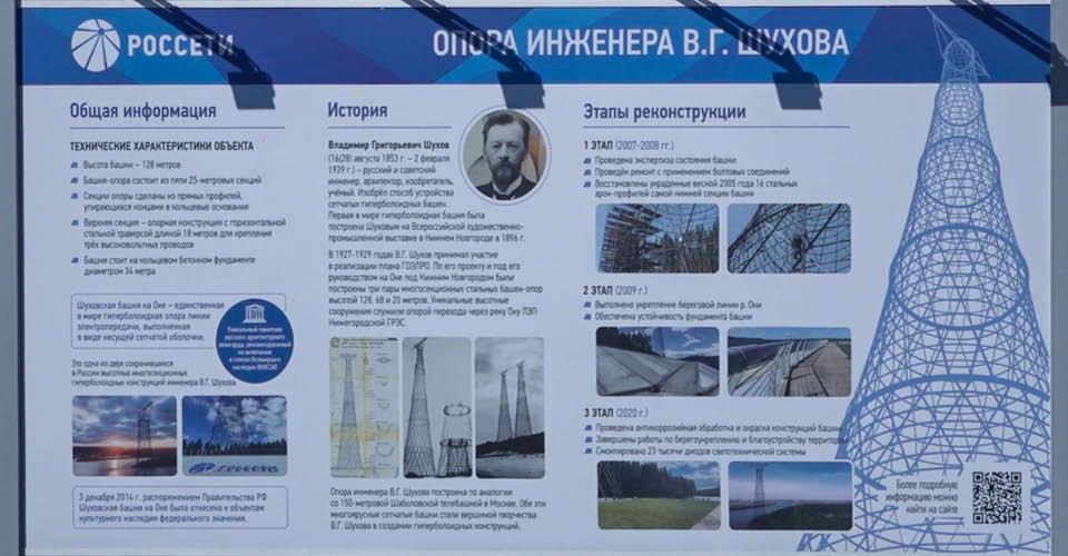 Сегодня Шуховская башня, расположенная в Дзержинске (Нижегородская область) – уникальный памятник русского авангарда, рекомендованный к внесению в список Всемирного наследия ЮНЕСКО. Это единственная в мире гиперболоидная многосекционная опора линии электропередачи, выполненная в виде несущей сетчатой оболочки (первоначально башня входила в комплекс высоковольтного спецперехода через Оку).