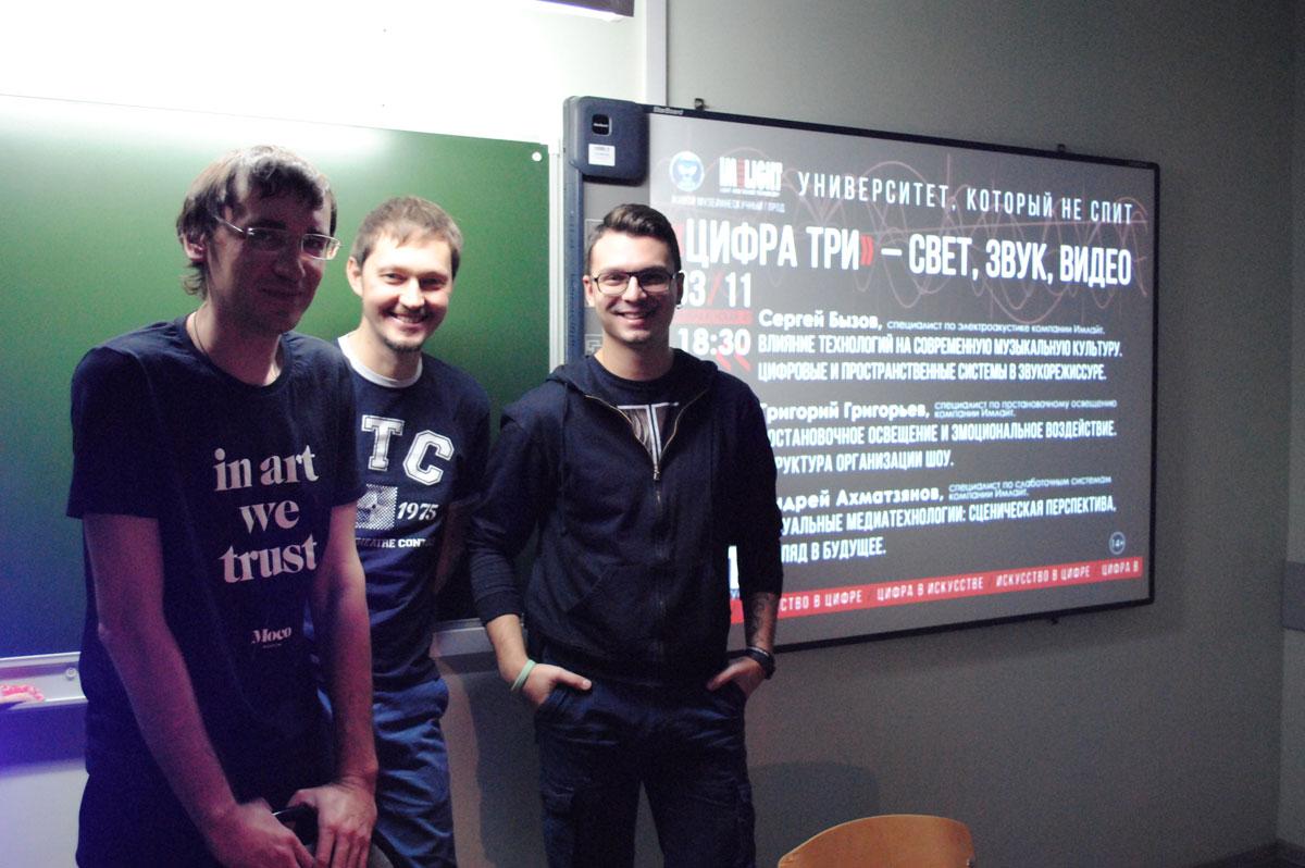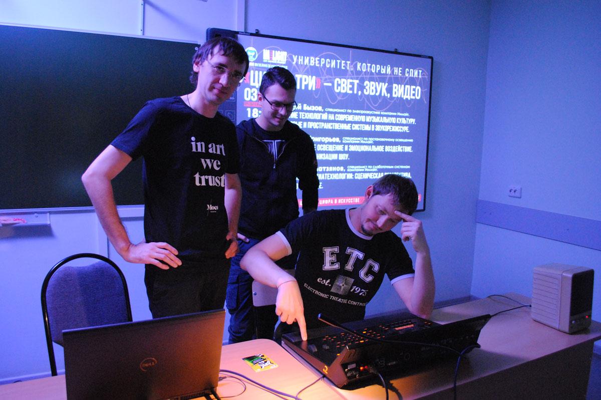 От революции в звуке – к эволюции в свете. Вторая часть лекции была посвящена истории постановочного освещения и его эмоциональному воздействию на зрителя. Григорий Григорьев, сумел «открыть» мир театра с новой для студентов-культурологов стороны, а именно – со светотехнической: от костров на заднике античного театра до современного светового дизайна. Финалило цикл мини-лекций «Цифра три» выступление Андрея Ахматзянова, специалиста по слаботочным системам, посвященное визуальным медиатехнологиям, экспериментам со сценической перспективой и опытам по созданию виртуальных артистов и голографических шоу.