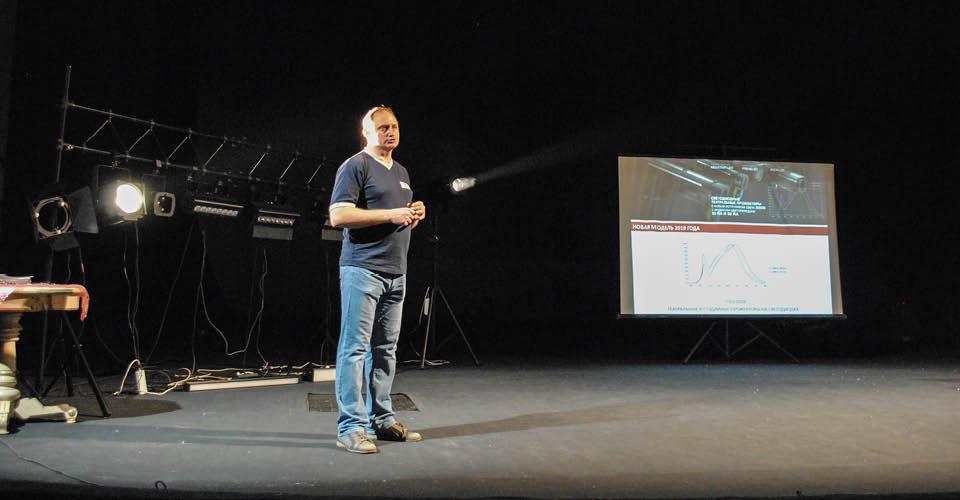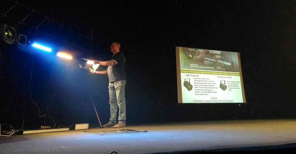 Также слушатели семинара увидели новую линейку приборов THEATRE LINE с микшером цвета RGBL. Эти приборы хорошо смешивают цвет освещения и дают больше вариантов цветного света, а значит лучше, чем приборы RGB и RGBW, соответствуют задачам театрального освещения. В прожекторах THEATRE LINE используется источник света LUMILEDS (США), благодаря которому приборы стали в 3 раза эффективнее по сравнению с приборами прошлых версий PAR RGBW 70.