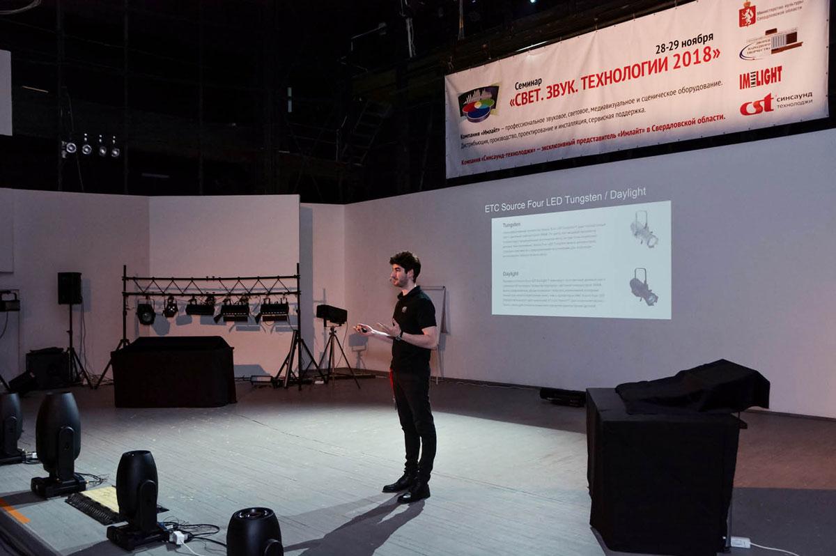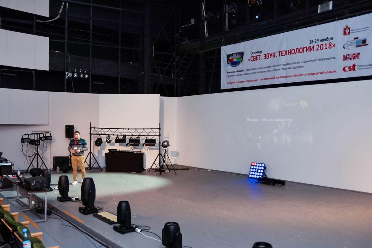 Далее семинар продолжился сразу в двух тематических залах. Открыли первый учебный день Владимир Зверев, бренд-менеджер театрального освещения ТМ IMLIGHT (Киров), и Яков Кейлин, звукорежиссер Центра культуры «Урал» (Екатеринбург).
