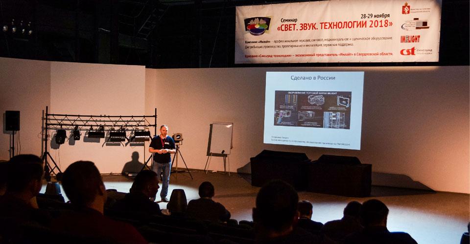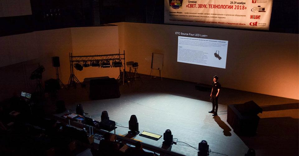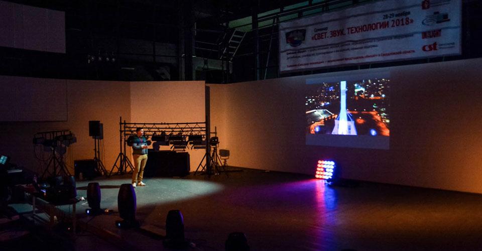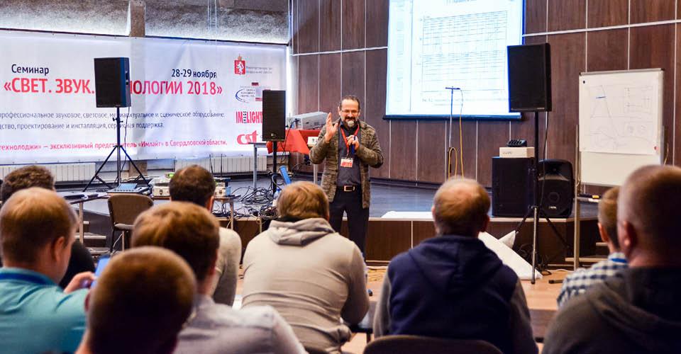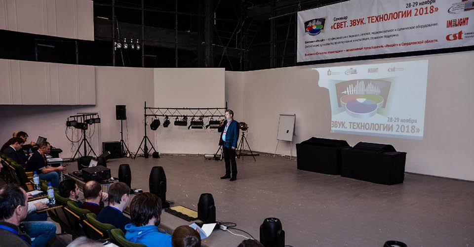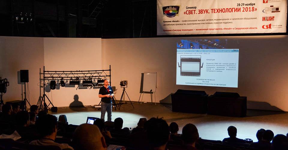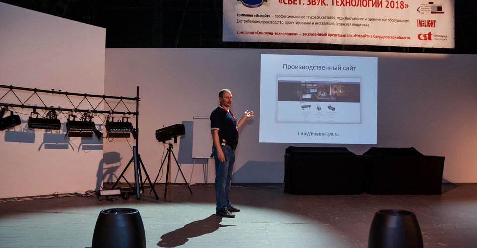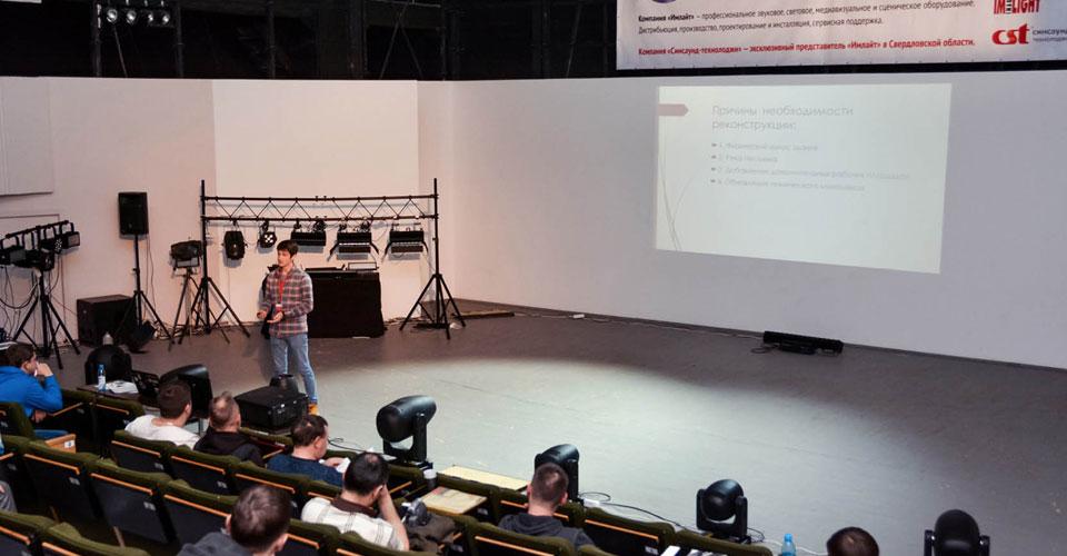 Далее семинар продолжился сразу в двух тематических залах. Открыли первый учебный день Владимир Зверев, бренд-менеджер театрального освещения ТМ IMLIGHT (Киров), и Яков Кейлин, звукорежиссер Центра культуры «Урал» (Екатеринбург).