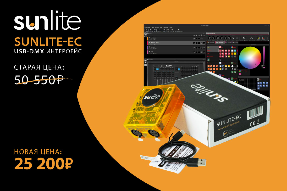 Мы запускаем распродажу компьютерного USB-DMX интерфейса от Nicolaudie - SUNLITE-EC. Теперь приобрести SUNLITE-EC можно вдвое дешевле. Новая цена 25 200 рублей вместо 50 550.