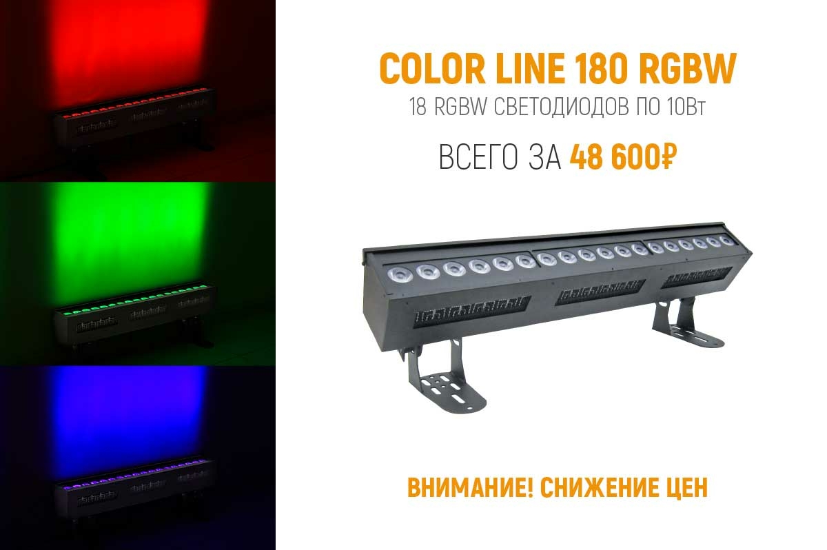 COLOR LINE 180 RGBW – это мощный прибор направленного света (угол расхождения 10 градусов). В формате светодиодной линейки имеет 18 RGBW-матриц по 10 Вт.