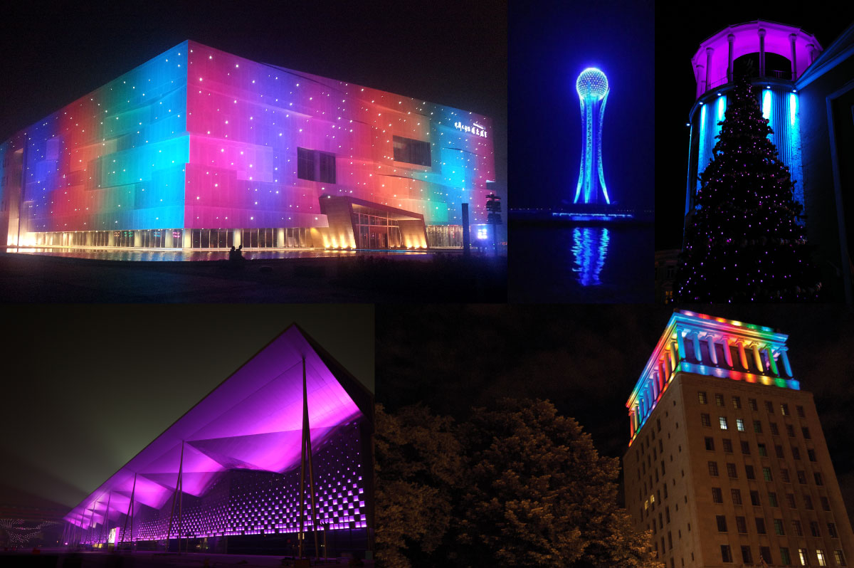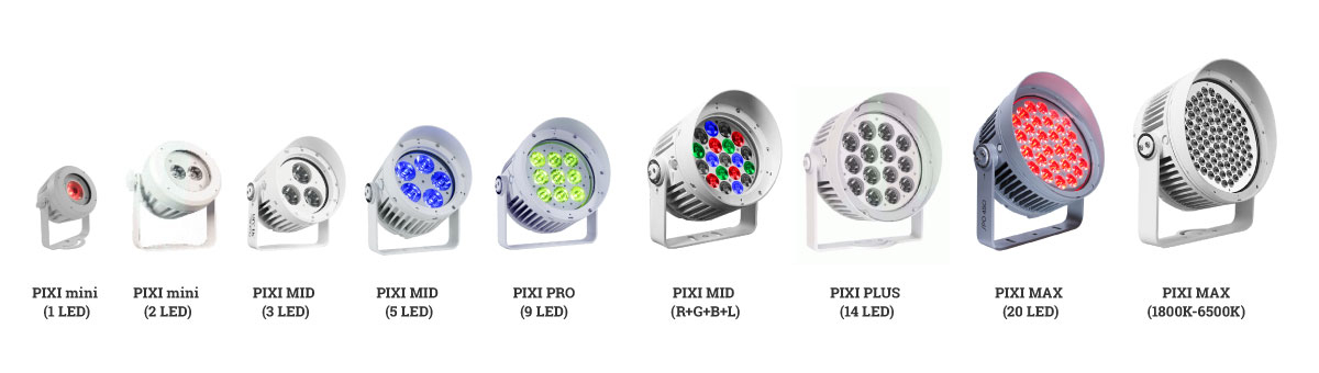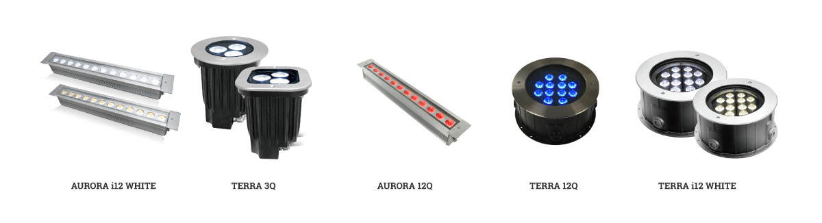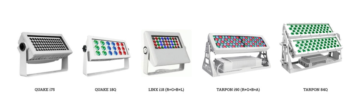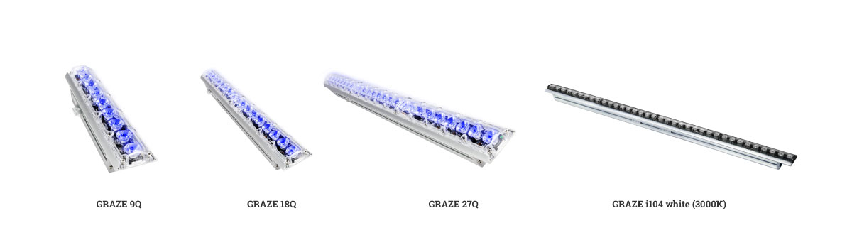 • Линейные светильники серии Graze. Так называемые LED BAR производятся в четырех основных типоразмерах длин - 305, 610, 915 и 1220 мм. Предназначены для освещения объектов вдоль вертикальных поверхностей или освещения вдоль плоскости для акцентного выделения длинных архитектурных конструкций. Имеют секторальное управление для создания пиксельных эффектов смены цвета.
