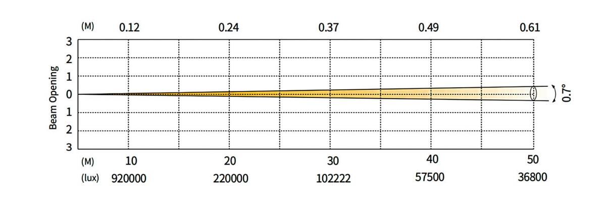 Фронтальная линза диаметром 180 мм дает равномерный и практически параллельный луч с углом расхождения в 0,7° и освещенностью 220 000 люкс на 20 м. Луч настолько ровный, что на дистанции 50 м диаметр пятна освещения составляет всего 0,6 м. Прибор относительно безопасен и имеет протоколы испытаний безопасности TUV.