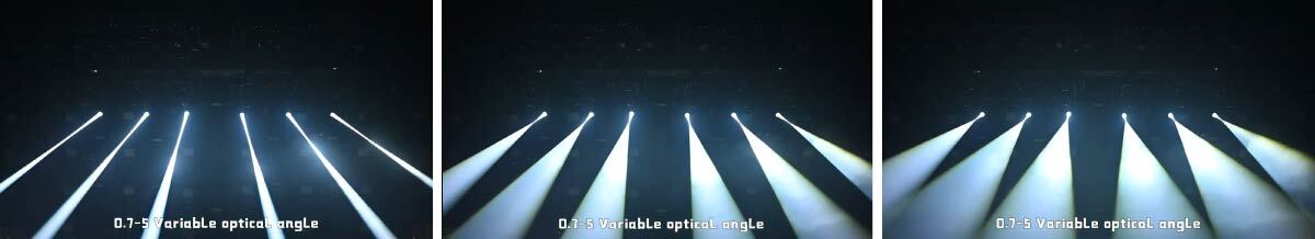Угол раскрытия луча может варьироваться в пределах 0,7° - 5° градусов, что в совокупности с другими эффектами дает дополнительное разнообразие и многофункциональность работы прибора.
