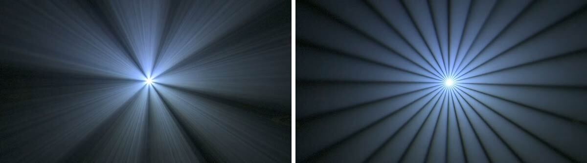 Напомним теорию – чем ближе источник света приближается к точке, тем лучше работают законы оптики, и тем более детально можно сфокусировать изображение, находящееся в точке фокуса. Это имеет и обратную сторону: тем более идеальным должно быть изображение трафарета - даже микронные заусенцы или царапины могут быть заметны на проецируемом изображении. Все световики знают, как можно «играться» фокусом на стеклянных «водяных» гобо, а если у вас в руках гораздо более продвинутый инструмент, возможности изменения картин становятся еще шире, создавая кастомный морфинг проекции.