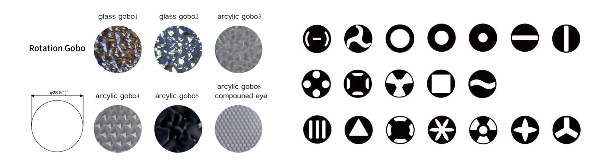 Колесо фиксированных гобо имеет 19 трафаретов, в том числе 4 апертуры для уменьшения толщины луча. На втором колесе – 6 вращающихся в обоих направлениях гобо - стеклянные и акриловые, объемные.