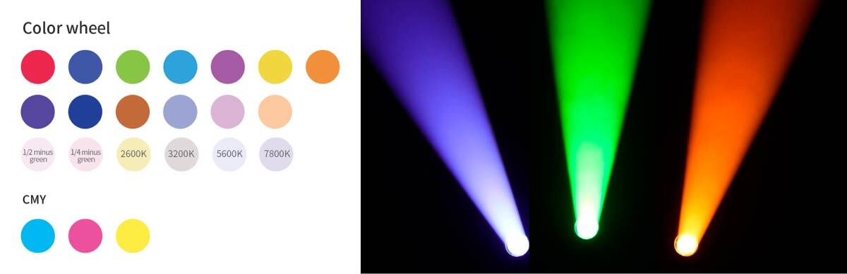Основное цветосмешение осуществляется лезвиями-фильтрами CMY на высоких скоростях так, что переход из одного цвета в другой практически не заметен. Дополнительно присутствует 19 фиксированных цветовых фильтров, создающих широкую палитру оттенков, среди которых: 1/2 minus green; 1/4 minus green; 2600K; 3200К; 5600K; 7800K. Открытый луч имеет весьма «холодную» цветовую температуру 11380K и индекс цветопередачи CRI:72,8Ra, а дополнительные ССТ-фильтры создают необходимую коррекцию для согласования с другими приборами на сцене (при необходимости). То есть прибор имеет бесшовную смену цвета и паттерны для театрально-студийного использования, чего нет в обычных BEAM-приборах для шоу или дискотечного применения.