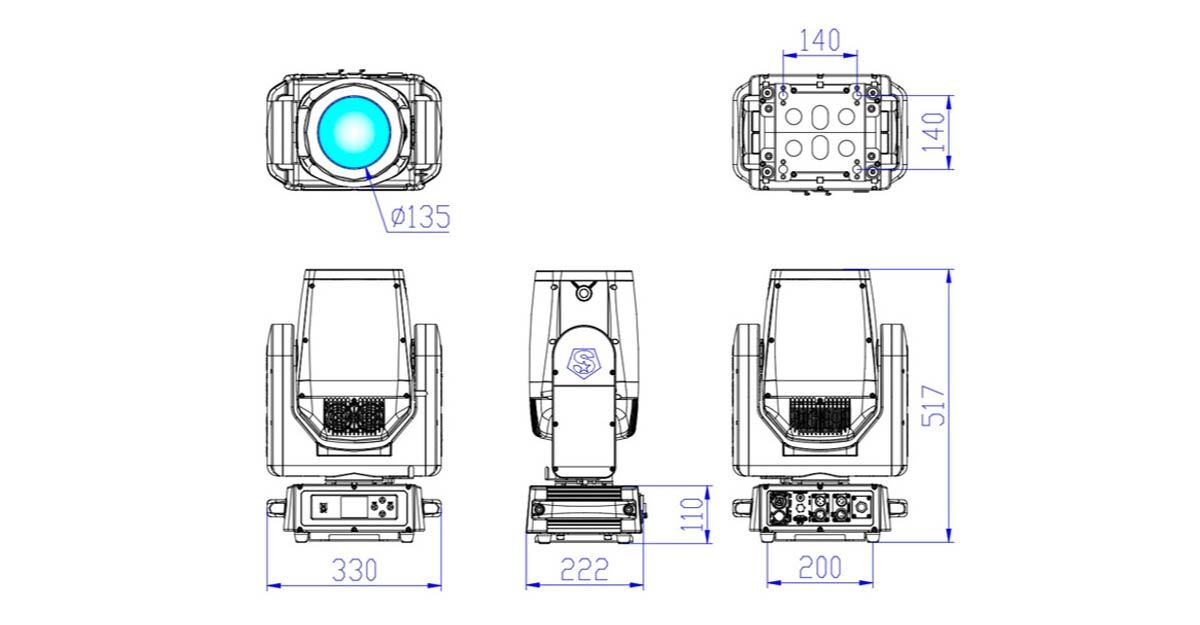 Фронтальная линза диаметром 135 мм дает почти идеально равномерный по распределению света и практически параллельный луч с углом расхождения в 1,2° и освещенностью на 20 м 120 000 люкс. Луч настолько ровный, что на дистанции 50 м диаметр пятна освещения составляет всего 1 м, поверхность освещена значительно ровнее, а сам луч отличается большей однородностью и насыщенностью по сравнению с аналогичными приборами на ламповых источниках света. Источник света: синий лазерный диод NICHIA с длиной волны 455 нм, свет которого проходит через люминофорное покрытие. Использование лазерного твердотельного источника освещения позволяет забыть о замене ламп и тепловых фильтров, сокращает расходные материалы. Гарантированный срок службы достигает 20 000 часов до падения яркости до уровня 85%, а полная деградация до 50% яркости наступает гораздо позже. Благодаря этому сокращаются затраты на техническое обслуживание и минимизируются простои оборудования. Кроме того, лазеры потребляют меньше электроэнергии, не восприимчивы к включениям и выключениям питания, обеспечивают плавное электронное диммирования с высокой точностью без заслонок, обладают идеальной фокусировкой света. Прибор относительно безопасен и имеет протоколы испытаний безопасности TUV, лазерный прибор - Class 1, группа риска – 3. Лазерные источники света уже давно отлично зарекомендовали себя в шоу-индустрии, и все больше моделей SS выходят с применением данной технологии.