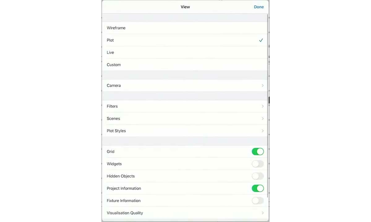 И тут всё также похоже на меню управления просмотром на десктопе. Каркасный, схематичный, живой или кастомный вид. Управление камерой и переключение между 5 редактируемыми позициями камеры. Фильтры, сцены, стиль схем. Включение и отключение сетки, виджетов, скрытых объектов, информации о проекте, информации о приборах и переключение качества визуализации. Всё это здесь.