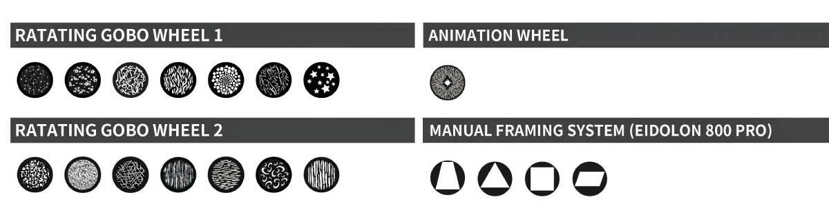 У модели EIDOLON 800 PRO дополнительно есть также 4 заслонки профилирования луча ручной предварительной настройки. Можно сказать, что световой поток и некоторые эффекты удвоились по сравнению с предыдущей моделью при незначительном увеличении массы и габаритов.