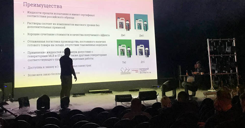 Напомним, что за основу жидкостей были взяты формулы растворов европейских производителей. Финальные образцы успешно прошли тестирования в различных условиях: в прокате, театре и ночном клубе. Все жидкости прошли необходимые испытания, по результатам которых был получен сертификат соответствия российского образца, и уже в начале 2023 года на склад «Имлайт» поступила первая крупная партия.
