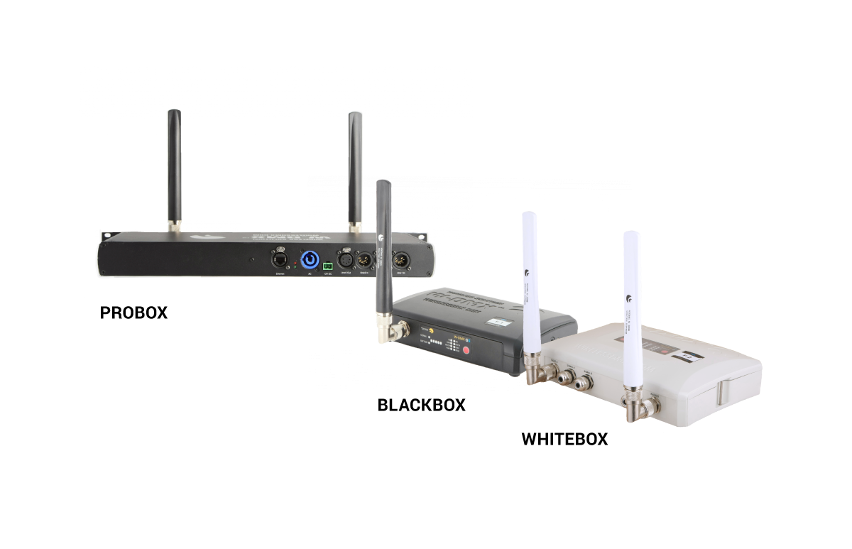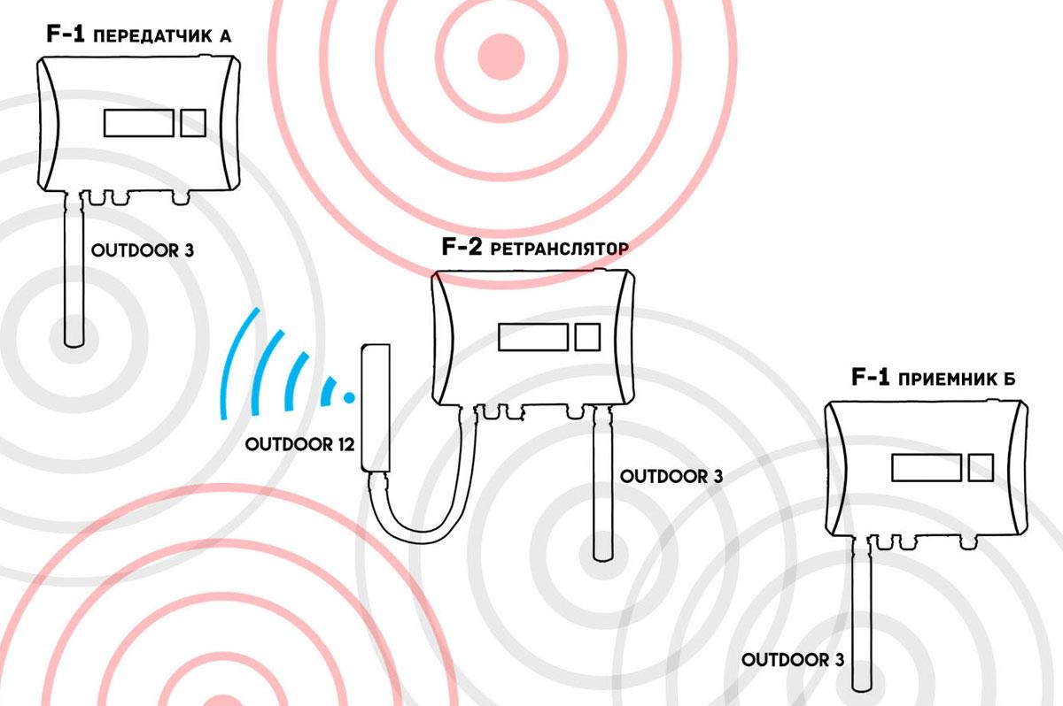 Модели с двумя антеннами серий BlackBox, WhiteBox и ProBox с литерами F-2, кроме режимов приемника и передатчика, могут быть настроены в режим ретранслятора для увеличения дистанции передачи сигнала. Данные принимаются от передатчика (A) и передаются без изменений к приёмнику (Б) – в этом случае одна линия DMX-512 прибора F-2 будет работать на приём, а вторая на передачу.
