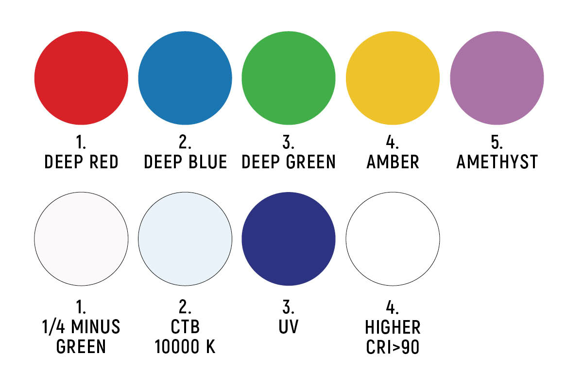 Система генерации цвета в светодиодном SYNERGY 7 PROFILE, помимо уже привычного модуля CMY, имеет линейный СТО-фильтр изменения цветовой температуры белого с возможностью очень плавной регулировки от 3000K до 7000K. В дополнение к линейному фильтру СТО прожектор имеет набор фильтров коррекции светового луча для использования в зависимости от поставленной задачи: «минус ¼ зеленого», «CTB 10000K», «высокий CRI >90» и УФ-фильтр. Ну и это ещё не всё. Есть ещё дополнительное колесо с пятью дихроичными фильтрами (глубокий красный, глубокий синий, глубокий зеленый, янтарный и аметист) и функция bi-color.