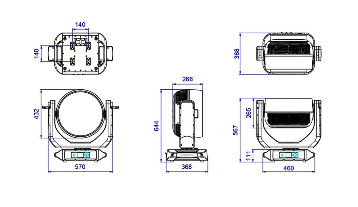 Защита IP66 позволяет уверенно работать в условиях до -20°С под снегопадом и до +45°С под куполом цирка, и это все с минимальными требованиями к обслуживанию. Мы не раз уже писали, что эта защита дополнительно дает: бесшумность, двойное применение IN/OUT DOOR, дополнительную надежность. Вентиляция прибора работает достаточно тихо, особенно в режиме STUDIO. Уровень шума в этом режиме всего 33 dB-A и это очень тихо! Уровень световой мощности для бесшумного использования падает примерно на 30%, но оно того стоит и света все еще более чем достаточно.