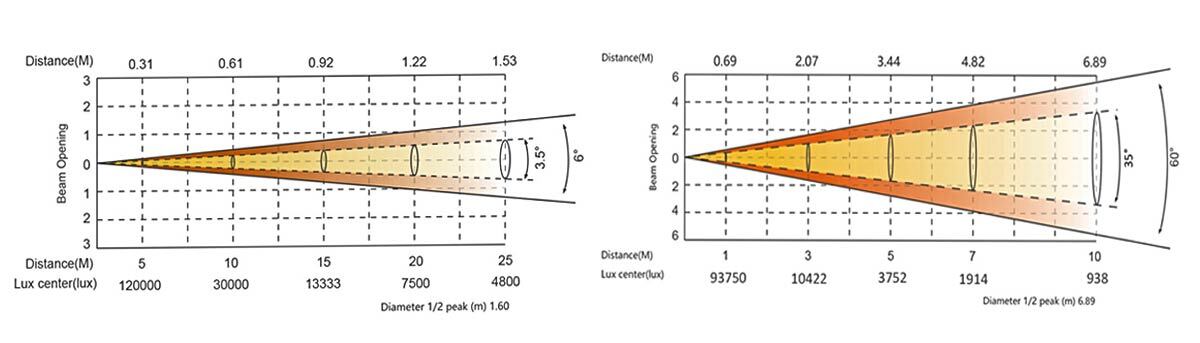 На дистанции 5 м освещенность равна 120 000 люкс при минимальном зуме (макс. сила света 3 млн. кандел) и 3752 люкс при максимальном зуме! Но NW10 рассчитан для работы на гораздо более дальние дистанции. Он создан для стадионов, высоких театральных подвесов, крупных концертных площадок. Диапазон зума 1:17 от 3,5° до 60° дает возможности очень широкого освещения ближних зон или заливку дальних дистанций. Градиент затухания по краям пятна освещения достаточно небольшой, чтобы луч смотрелся как РС BEAM при узком угле. Отсутствуют цветовые аберрации или «грязные» пятна даже при очень широком WASH-эффекте.