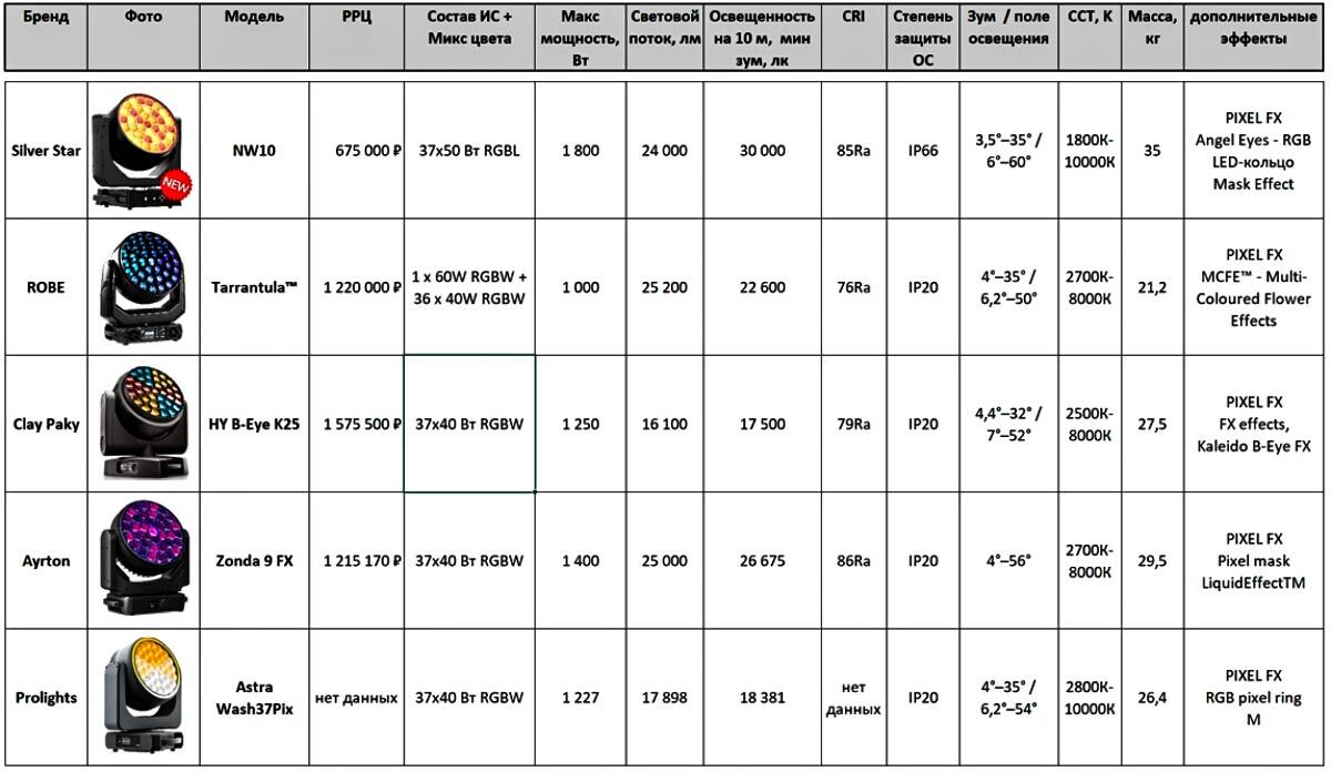 Для полного понимания места этого прибора на рынке без небольшого сравнения нам все-таки не обойтись. Наиболее близкий аналог по набору эффектов - это AYRTON Zonda 9 FX. Полностью одинаковых приборов не бывает (если только они не сделаны на одной фабрике, но по разным ОЕМ-контрактам), у каждого есть свои фишки, преимущества и недостатки. Почему некоторые модели потребляет значительно меньше энергии, чем должны при таких LED, а выдают весьма высокие показатели светового потока – не будем здесь разбирать. Обратим ваше внимание лишь на то, что единственный инструмент у пользователя под рукой, которым он можете проверить световые показатели – это люксметр или спектрометр. Освещенность на дистанции и в разных точках пятна освещения может дать вам большее понимание эффекта.