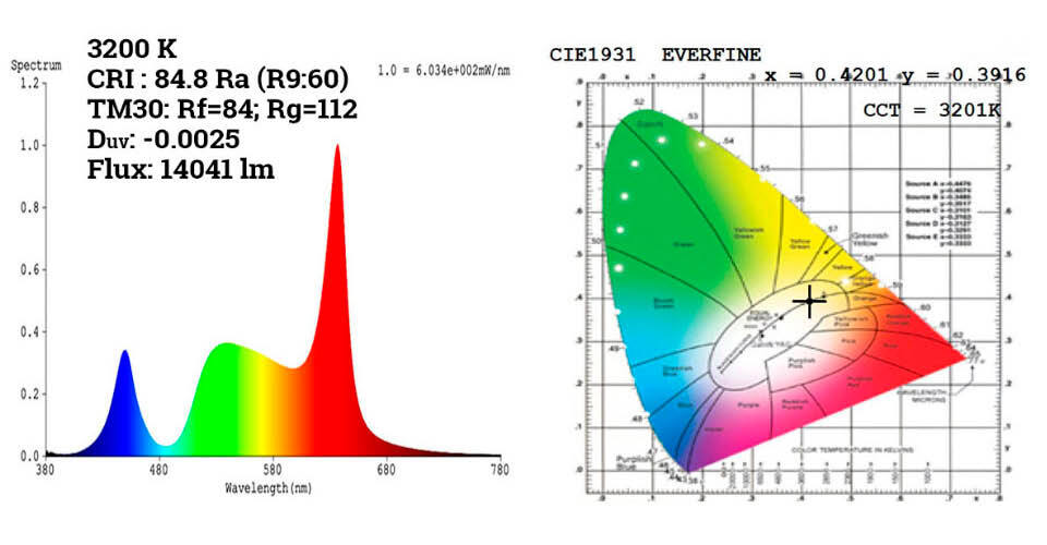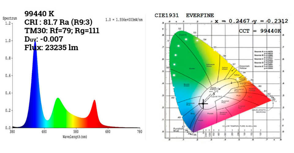 Напоминаем, что светодиод Lime является комплементарным цветом к фиолетовому оттенку, как результату смешивания современных RGB светодиодных матриц. При подмешивании Lime в RGB-синтез цвета повышается выход световой энергии, заполняется спектр излучения с улучшением CRI и исчезает фиолетовый оттенок в световых картинах (да, повторяем и будем повторять). Другими словами, сравнивая световые показатели у аналогичных приборов, необходимо сравнивать их на каком-либо белом, синтезированном, цвете, например, 3200 К, 4500К, 5600К. Для получения такого «цвета» стандартные RGBW-светильники снижают мощность синего светодиода вплоть до 50% (иногда и ниже), а фотометрические данные публикуют при максимальной мощности всех LED. Для примера: Astra Wash37Pix (Prolights) на широком зуме (когда выход светового потока максимален) при всех включенных LED выдает 17898 люмен. На том же зуме при выставлении на канале ССТ белый в 3200К – 9780 люмен. В то же время, RGBL при всех включённых LED на полную уже дает приемлемый нейтральный «белый».