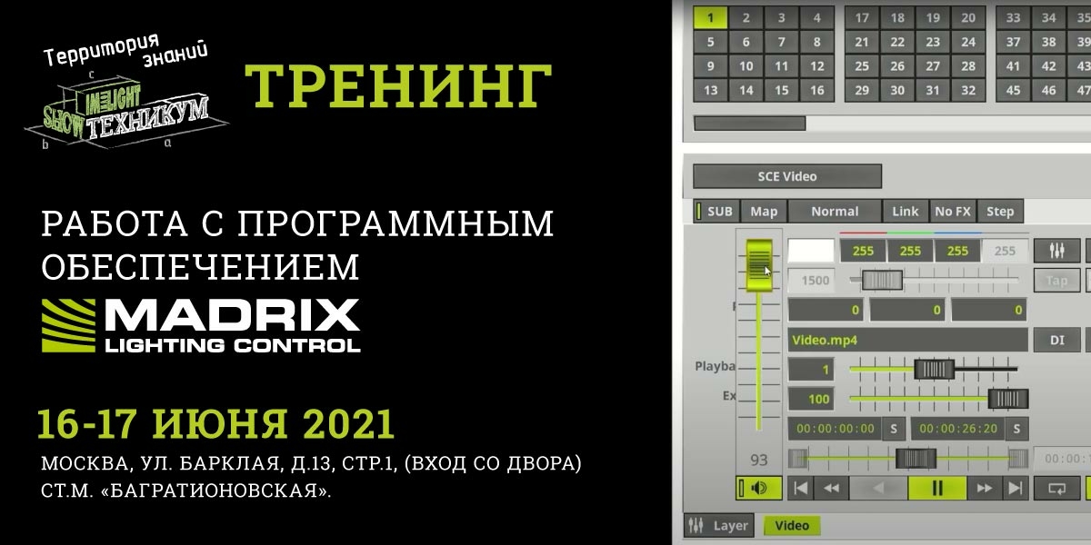 16-17 июня 2021 года приглашаем вас принять участие в очередном обучающем тренинге по работе с программным обеспечением MADRIX для управления массивами светодиодных пикселей. Двухдневный обучающий курс в рамках образовательного проекта «Шоутехникум - территория знаний» состоится в конференц-зале нового московского офиса компании «Имлайт».