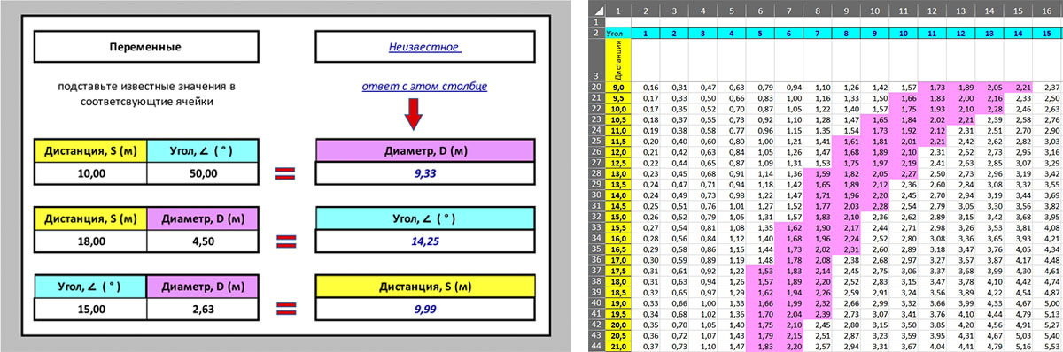 Чтобы расчеты стали проще, предлагаем воспользоваться готовой таблицей зависимости размеров (диаметров) зон освещения от расстояния и угла освещения, в которой выделены наиболее востребованные типоразмеры зон освещения людей на сцене. Дополнительно в файле создан простой «калькулятор», который при подстановке известных значений выдает искомый результат.