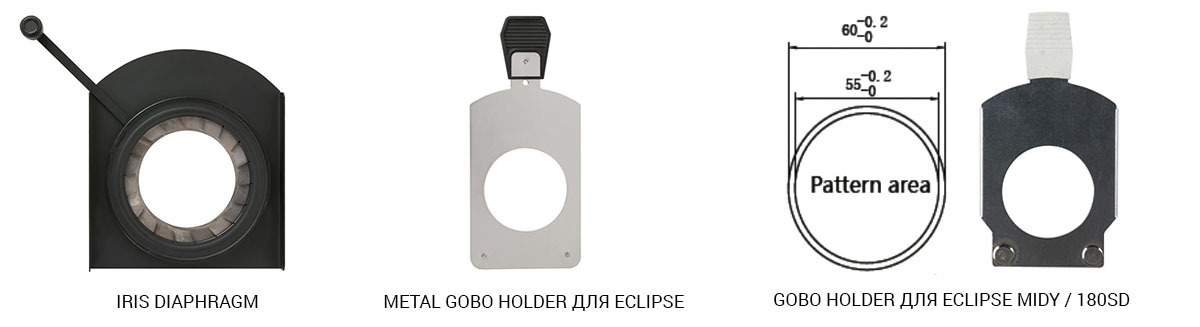 На что еще следует обратить внимание при выборе линзовой насадки? На размер желаемого изображения или пятна освещения влияет много параметров. Например, при установке ирисовой диафрагмы диаметр пятна освещения уменьшается примерно на 25% ввиду конструкции этого аксессуара и размера максимально открытой диафрагмы в 63 мм (например, для Silver Star, IRIS diaphragm для насадок в ECLIPSE X10072 ) и ее точки фокуса. Далее - профильный прожектор также предназначен для проецирования изображений. Для этого используются металлические и стеклянные гобо, которые тоже имеют некоторые ограничения размеров - это размер самого гобо и размер изображения, через которое будет проходить свет в точке фокуса. Как правило, используют два стандартных размера гободержателей: размер «А» и размер «В».