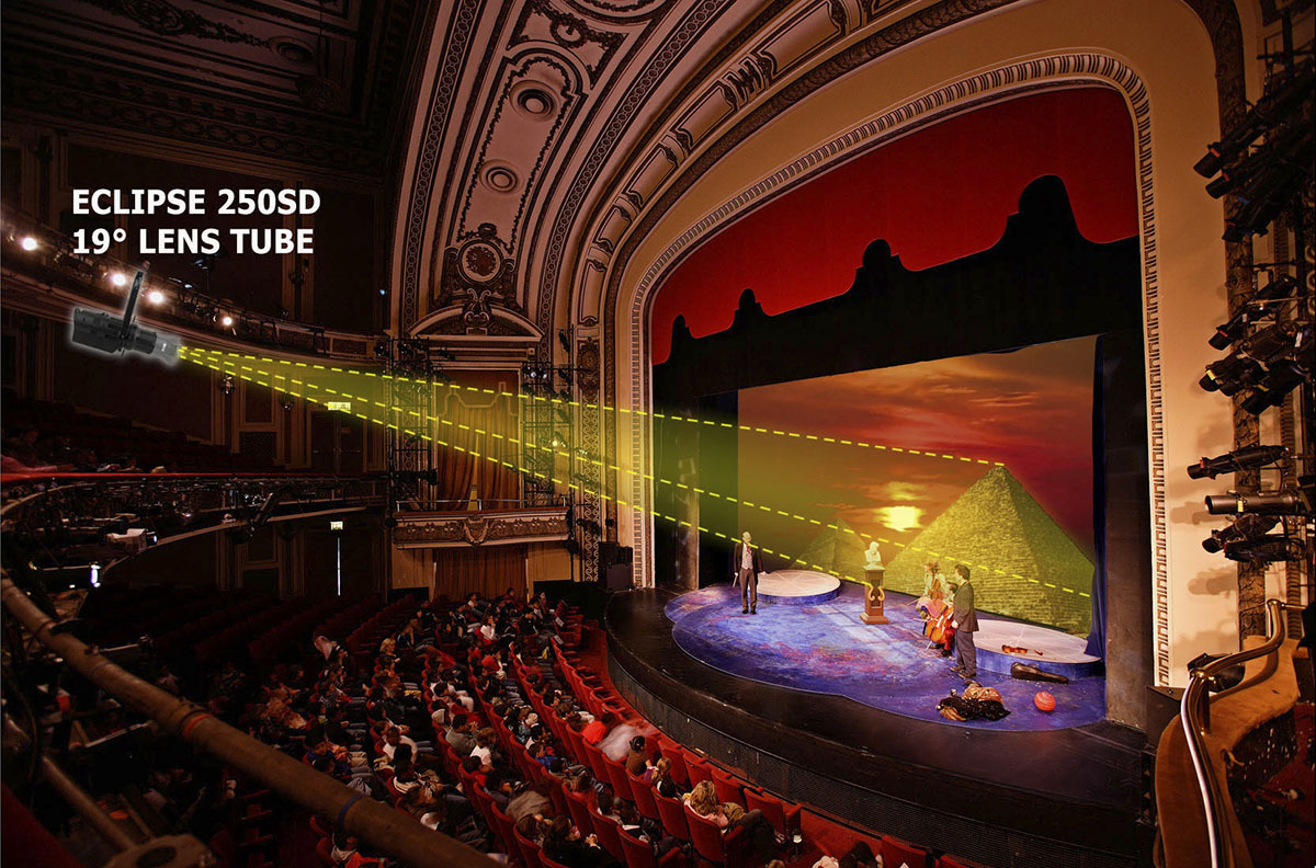 Например, пофантазируем. На спектакле «Мумия» на заднике сцены стоит декорация пирамиды Хеопса, которую надо высветить профильным прожектором с центрального выноса, отстоящего от задника сцены на 18 м. Обычно проекция четырехгранной пирамиды на плоскости представляет собой треугольник с тупым углом (чуть более 90°) у вершины и широким основанием. Представим, что конструкцию сделали шириной 4 м. Тогда ее высота должна быть примерно 1,7 м, стороны - по 2,8 м (исходя из известных размеров пирамиды). Тупой угол освещения профильными заслонками сделать сложно, но возможно. При этом вписанный в окружность треугольник будет меньше расчетного на 10-15%. Итак, радиус описанной вокруг треугольника окружности равен произведению его сторон, деленное на четыре его площади (по формуле Герона). Это можно рассчитать на онлайн-калькуляторах в Интернете. Диаметр у нас получился равный 4 м, то есть самая широкая часть фигуры – это диаметр пятна освещения. Чтобы получить пятно минимум 4,5 м (с запасом), воспользуемся таблицей и подставим «Дистанция» = 18 м, «Диаметр» = 4,5 м. Получаем угол освещения 14,25°. Можно, конечно, выбрать и 14° объектив, но лучше использовать следующий из линейки, а именно - 19° LENS TUBE для ECLIPSE X40213. Этот же объектив подойдет и для проецирования гобо такой пирамиды - прямоугольники считаются проще.