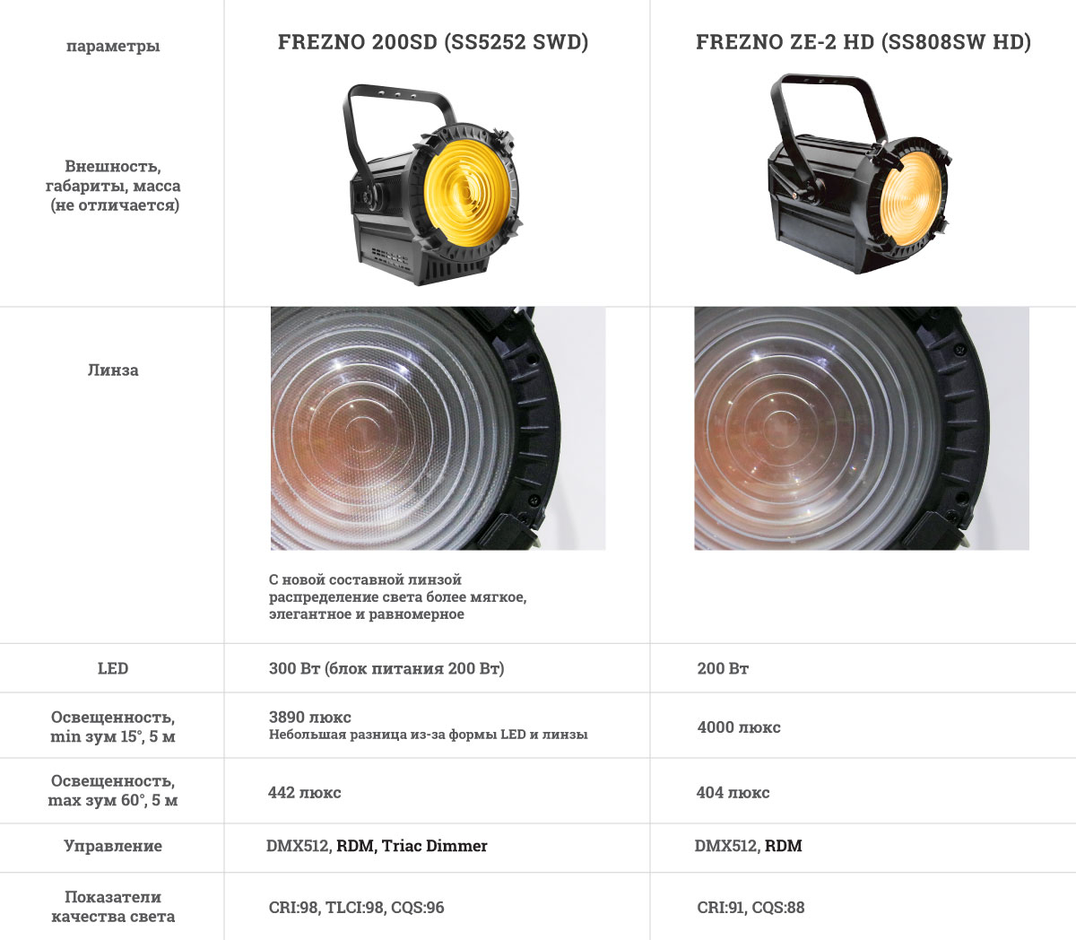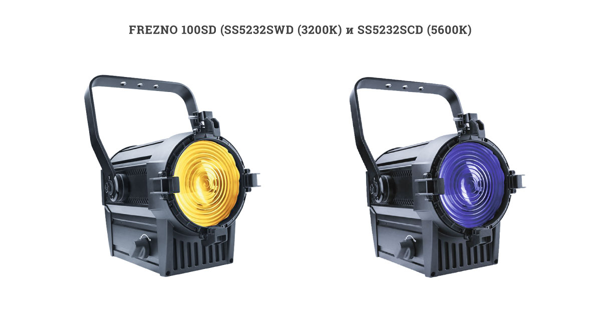 В сегменте аналогов 1200 Вт ламповых приборов, не вдаваясь в подробности, можно описать новый FREZNO 100SD, выпускаемый в версиях SS5232SWD (3200К) и SS5232SCD (5600К). Новый 100 Вт LED дает CRI:96,1 и показатель R9:95. Освещенность на 5 м при зуме 10°-60° составляет 3900 и 294 люкс соответственно, что значительно лучше по сравнению с предыдущим аналогом SS810SW HD FREZNO ZM-1 HD - 2100 и 186 люкс на аналогичных углах раскрытия луча. Новая линза, возможность подключения к диммеру, и, конечно, DMX, RDM.