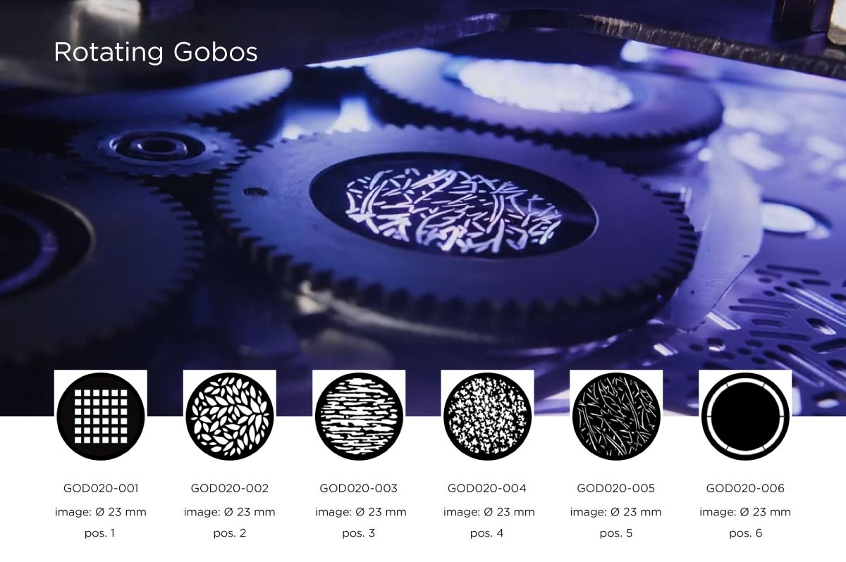 Блок эффектов не был бы полноценным без уже стандартных функций: дихроичные вращающиеся гобо-трафареты высокого разрешения — 6 шт., колесо анимации, заменяемая вращающаяся 4-гранная призма, 16-лепестковая ирисовая диафрагма.