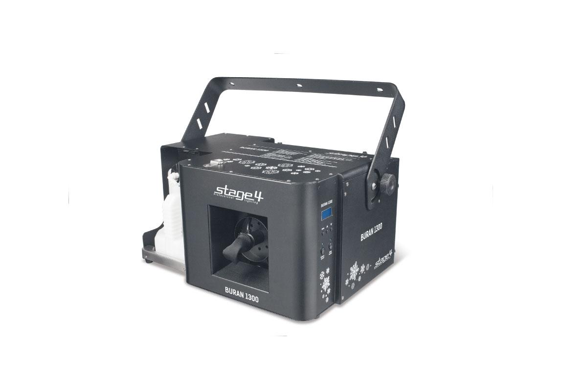 К достоинствам генератора снега BURAN 1300 можно отнести хорошую производительность, при невысоком уровне акустического шума, что особенно важно на театральных площадках. На максимуме прибор способен выбрасывать снежные хлопья на расстояние до 9 метров. Управление мощностью и скоростью вращения воздушной турбины осуществляется по протоколу DMX или с опционального пульта ДУ. Прибор оснащен LCD-дисплеем для отображения параметров или предустановленных режимов работы, имитирующих тип снежных осадков – от редких снежинок до настоящего снегопада. Конечно же для подвеса предусмотрена монтажная лира.