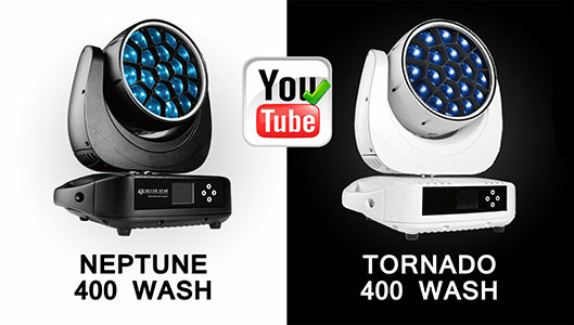 Как упрощенная альтернатива, но с более мощным заливным эффектом – это NEPTUNE 400 WASH (SS672XCEM) – заливающая поворотная голова со степенью защиты IP65. Девятнадцать 20-ваттных RGBW светодиодных чипов OSRAM создают мощное освещение от эффекта PC BEAM (6° и 3025 люкс / 10 м) до широкого WASH-луча с углом до 45 градусов.