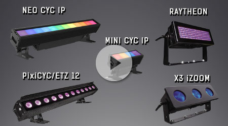 Серия всепогодных линейных светильников, среди них один из наиболее мощных и эффективных LED BAR – NEOCYC IP (SS361XALM) с пиксельным управлением и двенадцатью 30-ваттными RGBAL светодиодами,и различные прожекторы серии NOVA с очень широким диапазоном зума. Это также LED‑стробоскоп + мощная заливка SS353XCEM RAYTHEON
