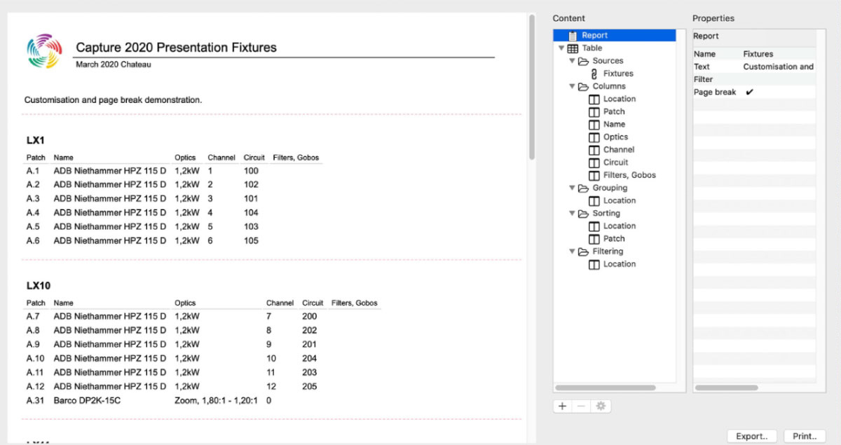 Capture содержит полную встроенную библиотеку осветительных приборов, ферм, светодиодных панелей и видеопроекторов. Важно отметить, что независимо от выбранной лицензии Capture, в проекте можно использовать столько прожекторов, ферм и объектов, сколько нужно. Для подготовки визуализации вполне можно обойтись без внешней DMX-консоли.