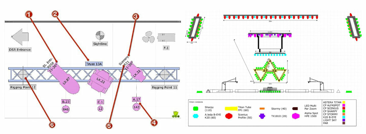 Прежде всего, Capture позволяет быстро подготовить схему размещения оборудования для заказчика или монтажников. Для начала необходимо перетащить нужные объекты на рабочее поле и расположить их – схема с описанием готова! Для визуализации же останется только «включить» эти прожекторы и направить. Иконки (символы) уже присвоены световым приборам, и остаётся только для наглядности раскрасить их в яркие цвета. Получаются простые, легко читаемые, красивые и понятные схемы размещения оборудования в различных плоскостях. На схемах показывается адрес прибора, DMX-линия, угол направки, применённый светофильтр или даже сменная оптическая линза.