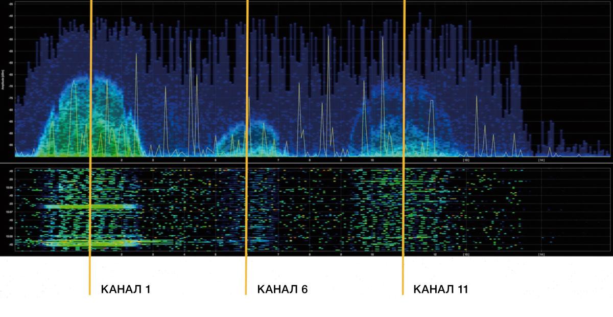 Ниже на графике показано, что именно на каналах 1, 6 и 11 отмечаются пиковые значения магнитного излучения рабочей полосы, при этом заметно, что спектральная плотность достаточно сильно отличается на разных полосах. Полоса частот вокруг канала 6 наименее загружена, а, следовательно, целесообразно организовать передачу данных именно по ней.