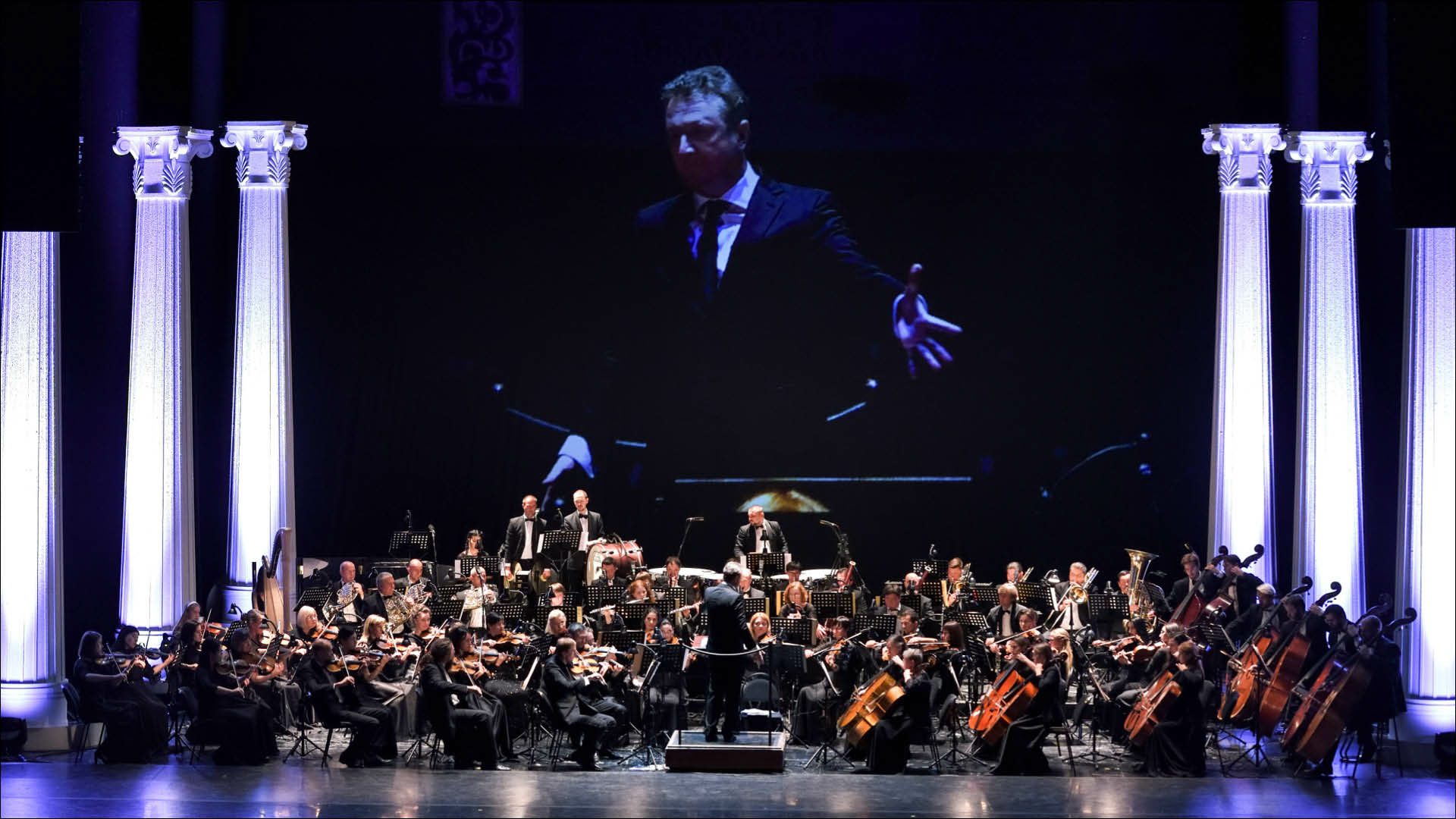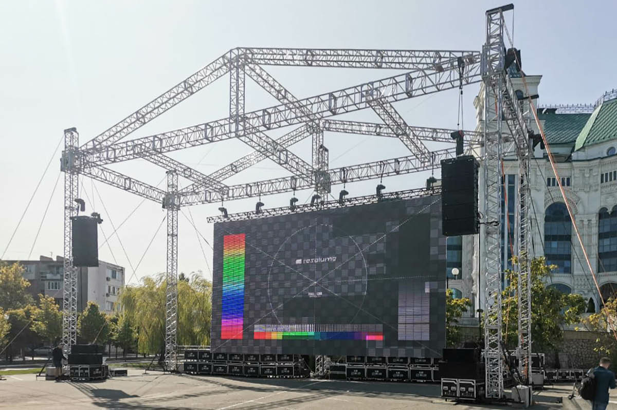 На большом гала-концерте, который транслировался онлайн для самой широкой зрительской аудитории, Астраханский театр хотел удивить звучанием оркестра. Наши инженеры выполнили акустические расчёты для равномерного и полноценного озвучивания каждого сектора многоуровневого зала театра и в дополнение к имеющемуся электроакустическому комплексу оперной площадки установили систему звукоусиления MEYER SOUND с участием MICA, M'elodie, сабвуферов LFC-1100, а также акустических систем ULTRA X40, недавно пополнивших технический парк IMLIGHT SHOW PRODUCTION. Для снятия звука с оркестра из 80 музыкантов было использовано более 70 специализированных микрофонов. На улице в театральном парке работала система звукоусиления MEYER SOUND LEO – здесь на огромном экране площадью 144 кв. м велась прямая трансляция концерта. Экран был установлен на алюминиевой конструкции производства ТМ IMLIGHТ площадью 21 на 7 метров и общей высотой 12 метров.