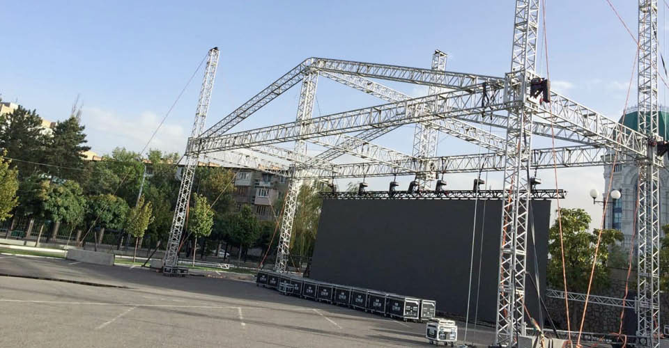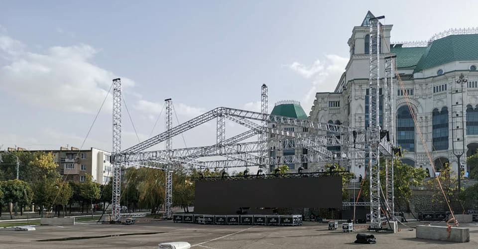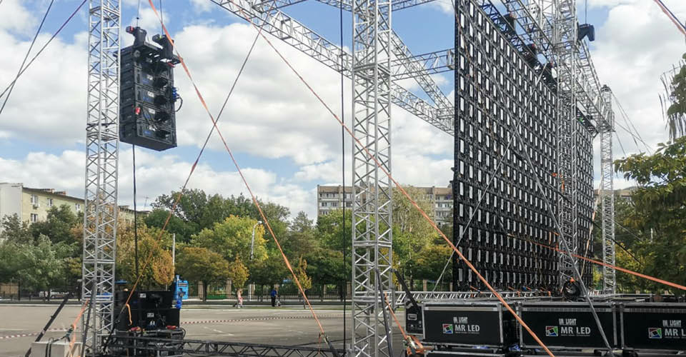 На большом гала-концерте, который транслировался онлайн для самой широкой зрительской аудитории, Астраханский театр хотел удивить звучанием оркестра. Наши инженеры выполнили акустические расчёты для равномерного и полноценного озвучивания каждого сектора многоуровневого зала театра и в дополнение к имеющемуся электроакустическому комплексу оперной площадки установили систему звукоусиления MEYER SOUND с участием MICA, M'elodie, сабвуферов LFC-1100, а также акустических систем ULTRA X40, недавно пополнивших технический парк IMLIGHT SHOW PRODUCTION. Для снятия звука с оркестра из 80 музыкантов было использовано более 70 специализированных микрофонов. На улице в театральном парке работала система звукоусиления MEYER SOUND LEO – здесь на огромном экране площадью 144 кв. м велась прямая трансляция концерта. Экран был установлен на алюминиевой конструкции производства ТМ IMLIGHТ площадью 21 на 7 метров и общей высотой 12 метров.