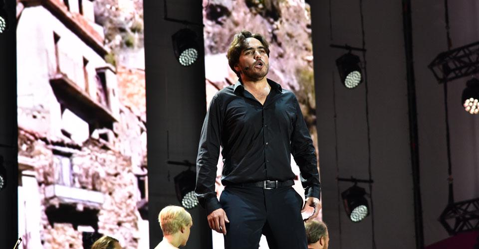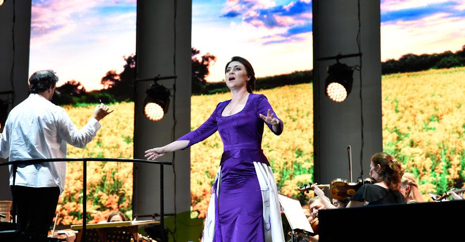 Центральные экраны (5 полос по 2,5 x 6 м) мы использовали в качестве видеодекораций к оперному спектаклю, чтобы максимально погрузить зрителя в постановку. Также для трансляции оперного спектакля (а также в последующем для гала-концерта звезд мировой сцены) мы использовали портретные экраны с размерами 4,5 м x 7 м, которые были смонтированы на боковых порталах и на пультовой башне.