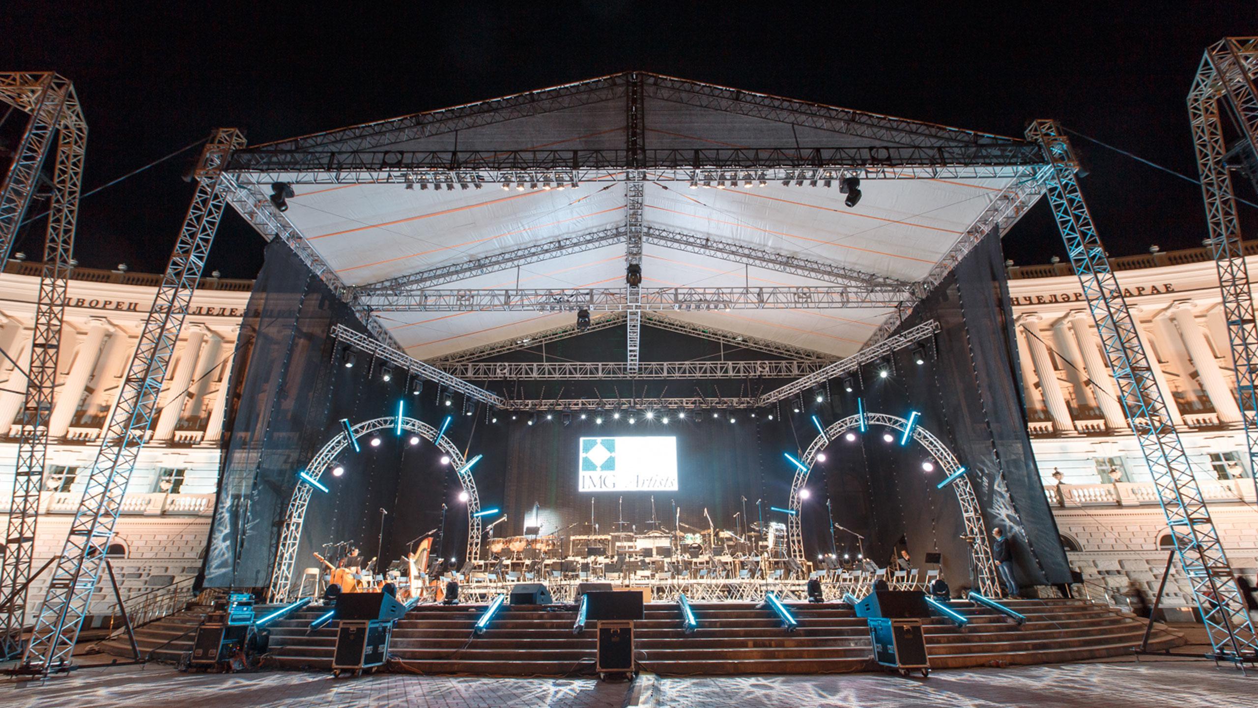 | Сцена | Сценический павильон из фермовых конструкций (торговой марки Imlight) – 20 х 14 м, высотой 12 м, оснащенный электрическими лебедками Chain Master |